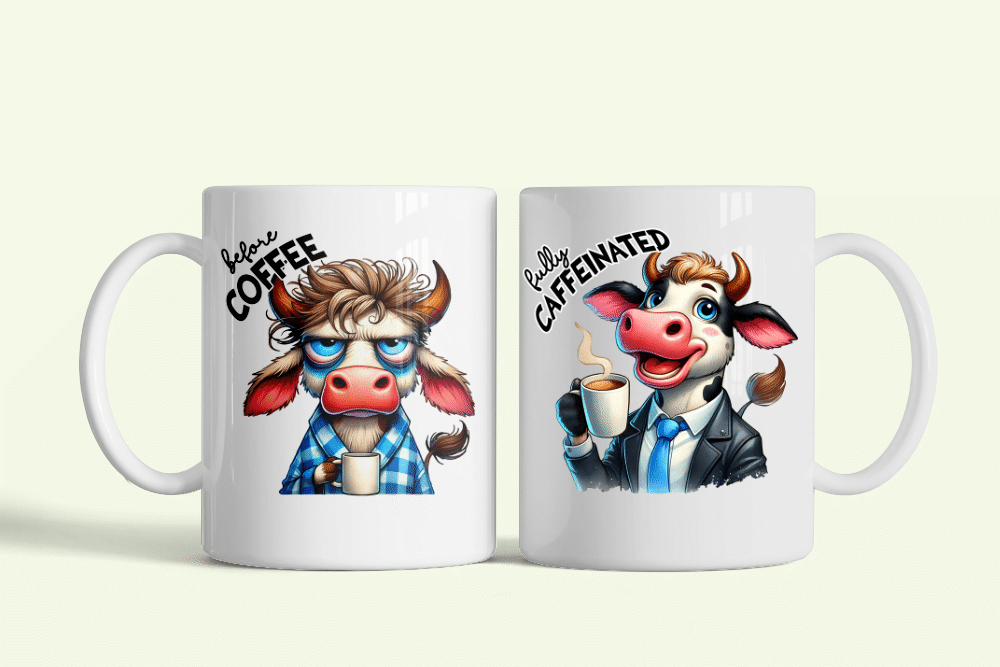 Ez nem csak egy bögre, ez egy életstílus! Az egyik oldalon meglátod a középkorú férfi / bika, ahogy a reggeli kávé előtt küzd az ébredéssel – ismerős, nem? A másik oldalon viszont ott van a kávé utáni változata: fényes mosollyal, energiával teli és készen az új kihívásokra.